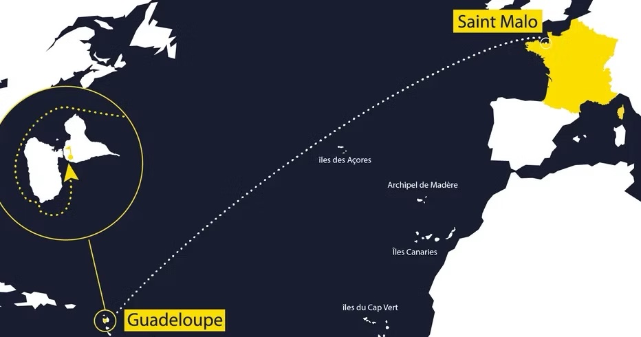 Bouée du Cap Fréhel à laisser à tribord, île de la Guadeloupe à contourner et à laisser à bâbord, îlot de la Tête à l’Anglais à laisser à bâbord et bouée de Basse-Terre à laisser à tribord.